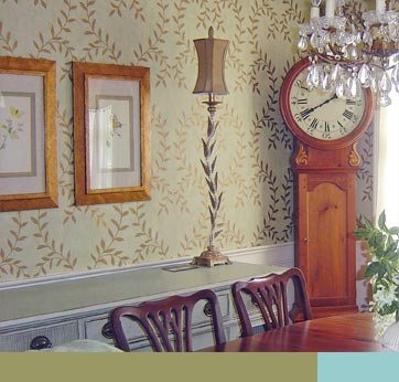 The meandering floral design on the walls of this dining room establish a pattern of texture and rhythm that carries through other elements of the room's interior. Mary Ellen McKee-Curtis incorporates the wall's floral motif in the elegant lamp and grandfather clock that adorn this dining room, to create a harmonious, comforting setting.