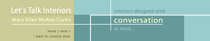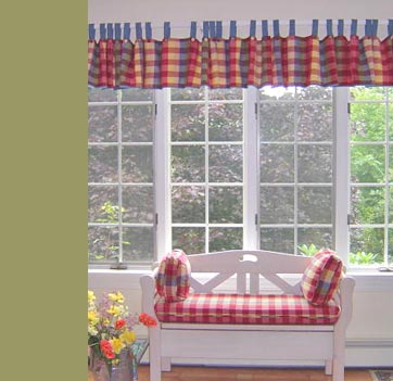 Set apart for intimate conversation or reflection, this country style bench is transformed into a cheerful and inviting place with its bold plaid fabric. Mary Ellen McKee-Curtis continues the color and texture into the window treatment, using a loop and button, country style valance. |