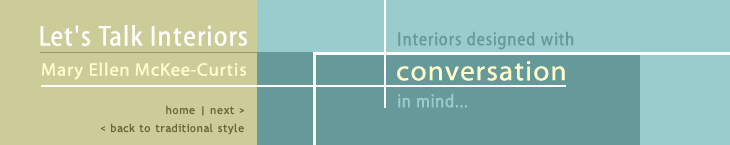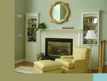 A fireplace and built-in alcoves serve as the traditional focus of this living room. Mary Ellen McKee-Curtis enhances the traditional features of this interior with contemporary accents such as the soft, sage wall finish and bold gold mirror hung over the mantle. The result is a living room that welcomes conversation and relaxation. |